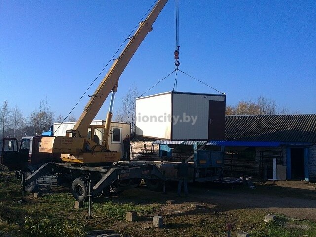 Доставка бытовок нашего производства осуществляется во все города Беларуси — Минск, Гродно, Могилев, Брест, Витебск и другие. Для погрузки и разгрузки бытовок используется манипулятор или кран, в зависимости от их рамера. Стоимость доставки оговаривается индивидуально. Для установки блок-контейнера необходимо подготовить ровную поверхность, очищенную от строительного мусора и насаждений.