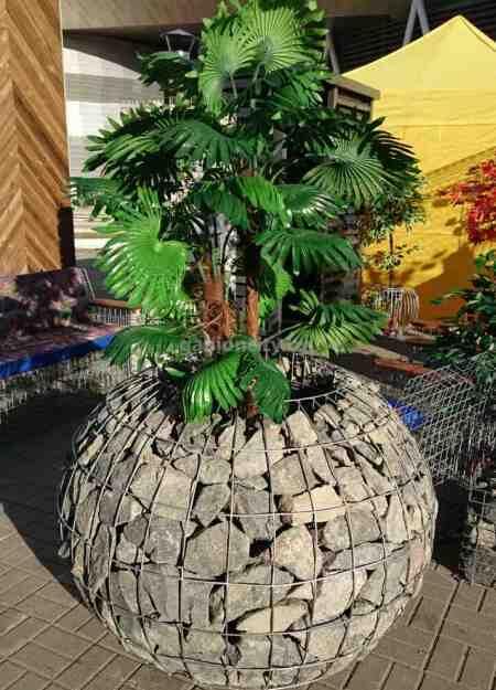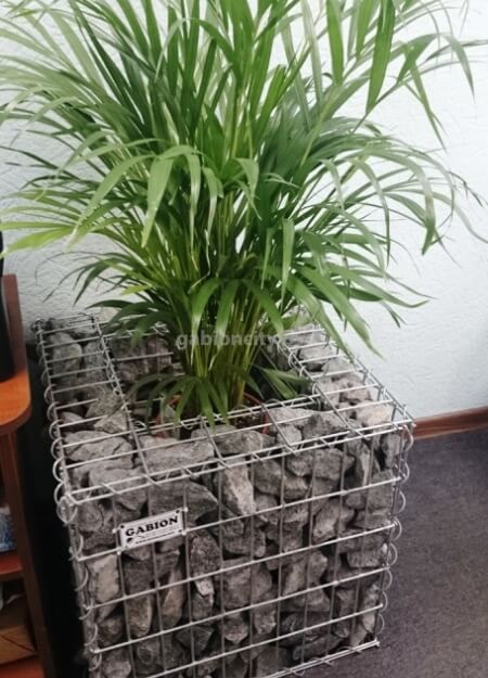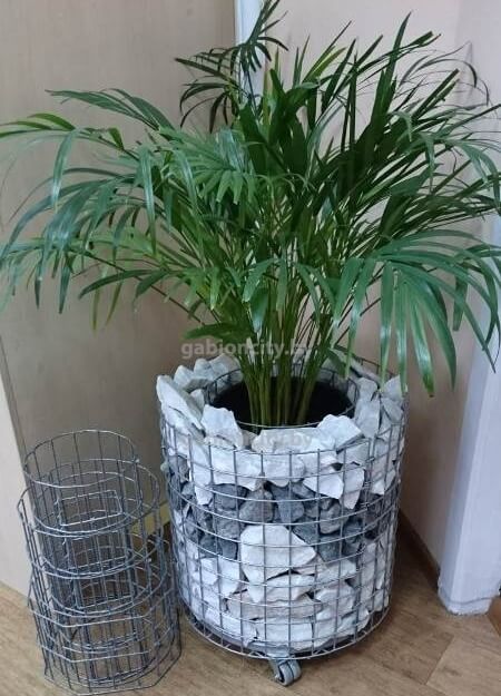 Габионные кашпо под цветочные горшки применяются и в интерьере. Они отлично подойдут для комнатной пальмы или декоративного дерева. Вазоны для комнатных цветов в интерьере устанавливаются на подставку с колесиками, сделанную из оцинкованного металла. Габионный вазон на колесиках очень удобен в использовании, его можно передвигать во время уборки или перестановки мебели.