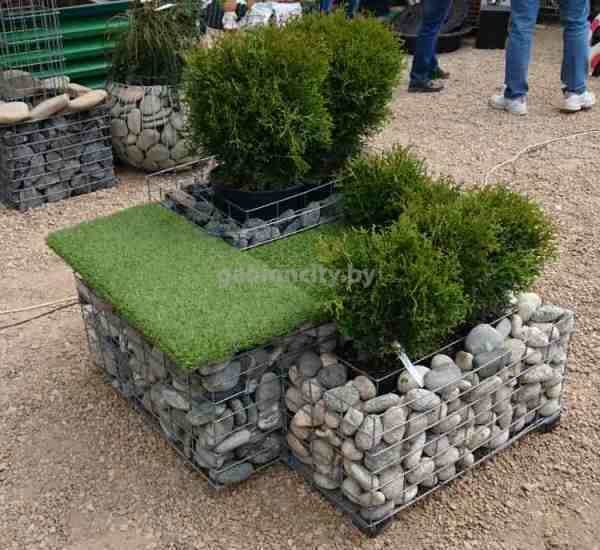 У нас можно купить цветочницу из камня в сетке, которая может быть двойной либо тройной, одноуровневой и многоуровневой. При желании ее можно переделать в скамью либо подставку.